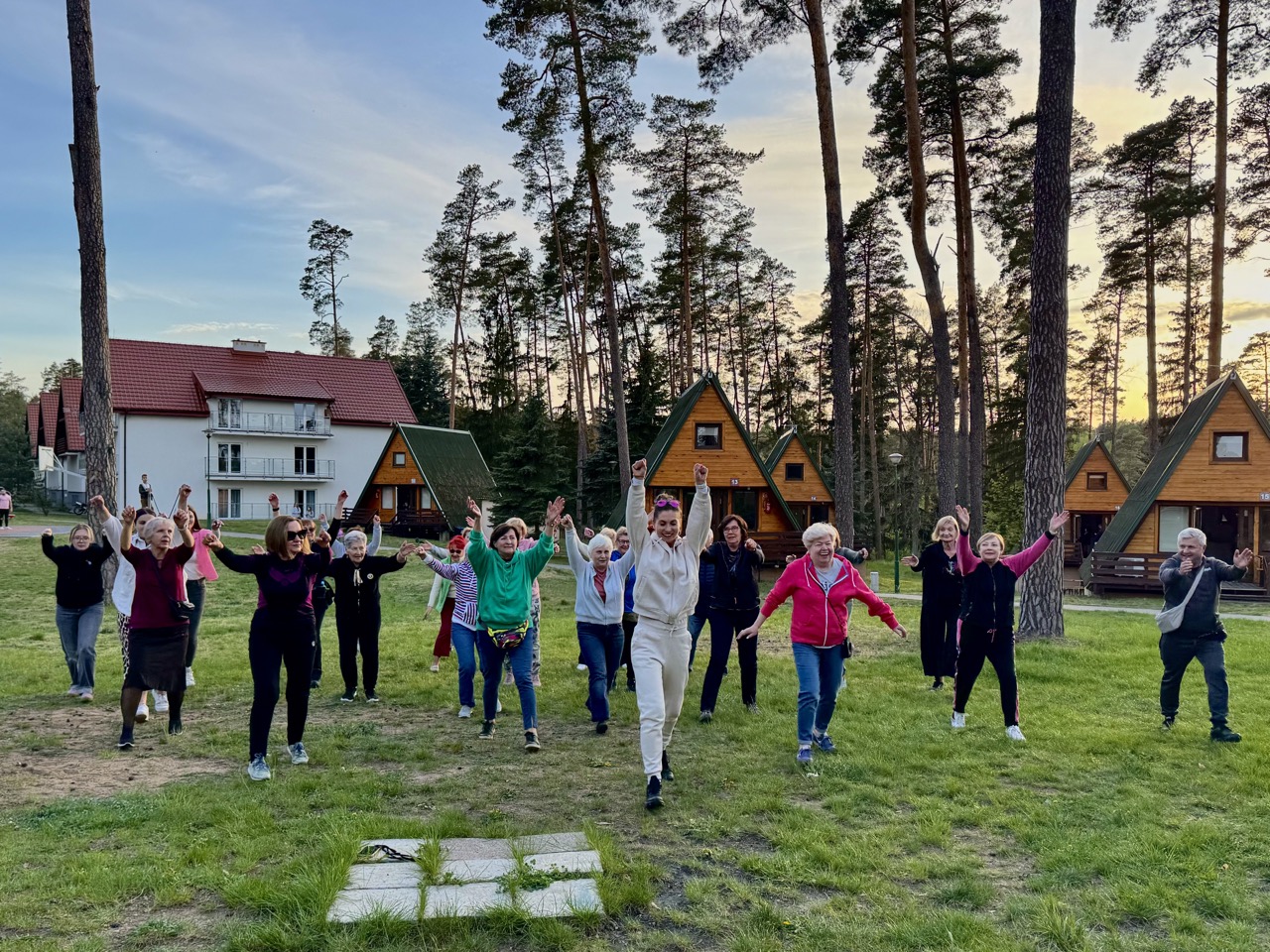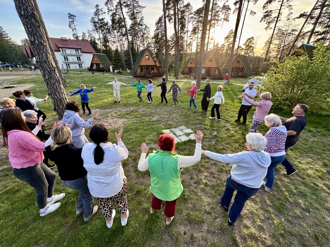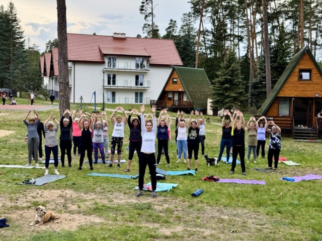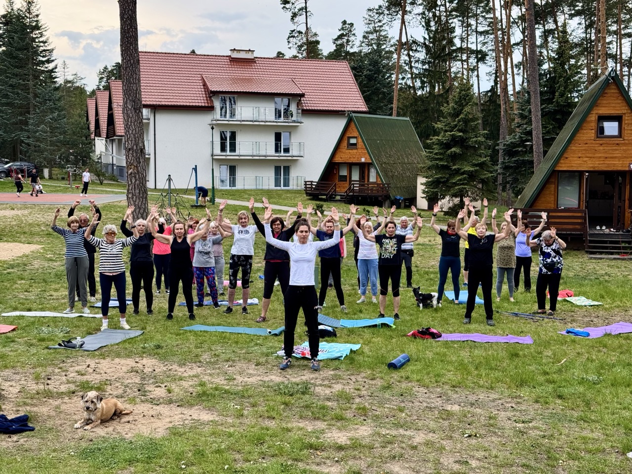 Zaczynając od pogody, która spełniła nasze oczekiwania na 150%, bo dopisała nam perfekcyjnie, a negatywne deszczowe i zimne prognozy się nie sprawdziły, dzięki temu wszystkie aktywności, które były przewidziane na wyjeździe odbywały się na dworzu. Zrobiliśmy sobie 6-km spacer do pobliskiego Giżycka, idąc wzdłuż jeziora a później pięknym szlakiem Św. Brunona. Z kijami poszliśmy także do pięknego mazurskiego lasu. Gimnastyki oczywiście także odbywały się na dworzu. Parafrazując klasyka: „Mazury! Tu się oddycha!”.