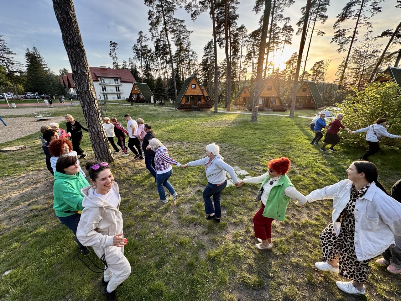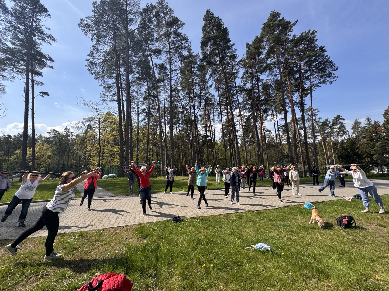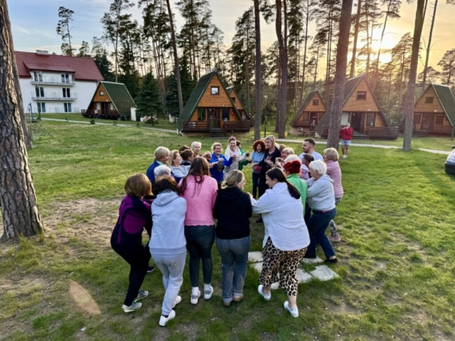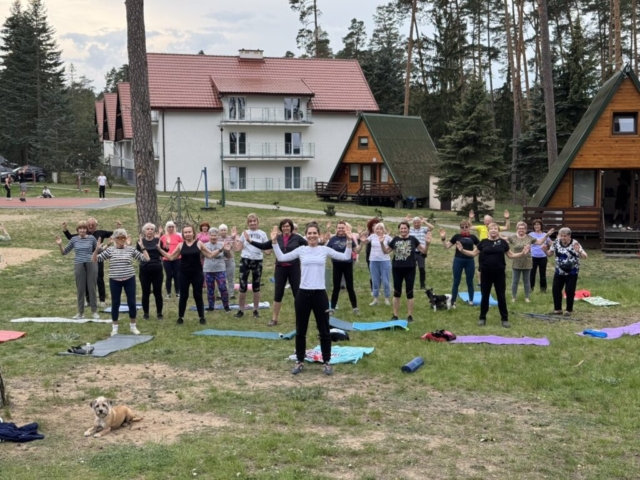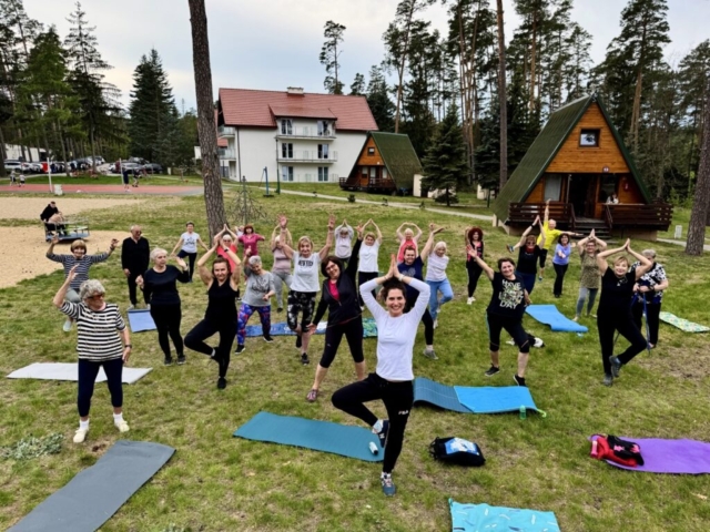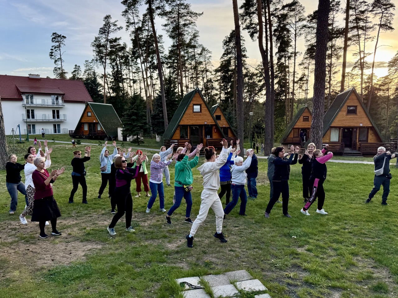 Zaczynając od pogody, która spełniła nasze oczekiwania na 150%, bo dopisała nam perfekcyjnie, a negatywne deszczowe i zimne prognozy się nie sprawdziły, dzięki temu wszystkie aktywności, które były przewidziane na wyjeździe odbywały się na dworzu. Zrobiliśmy sobie 6-km spacer do pobliskiego Giżycka, idąc wzdłuż jeziora a później pięknym szlakiem Św. Brunona. Z kijami poszliśmy także do pięknego mazurskiego lasu. Gimnastyki oczywiście także odbywały się na dworzu. Parafrazując klasyka: „Mazury! Tu się oddycha!”.