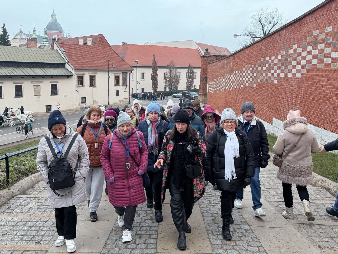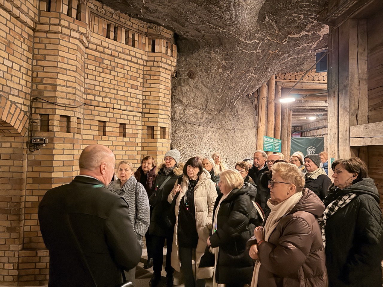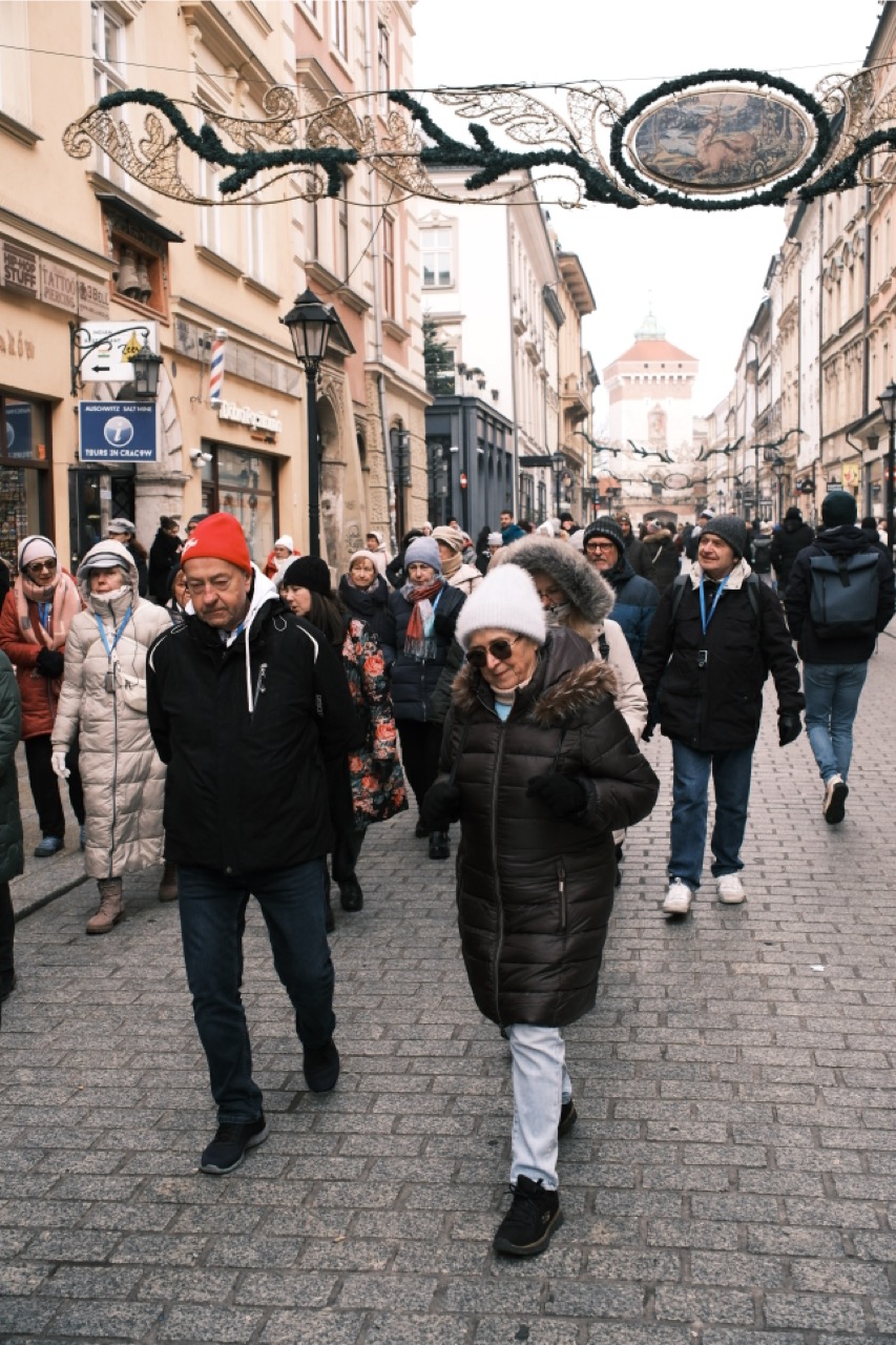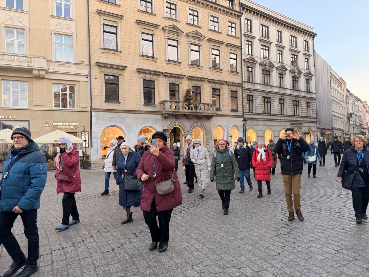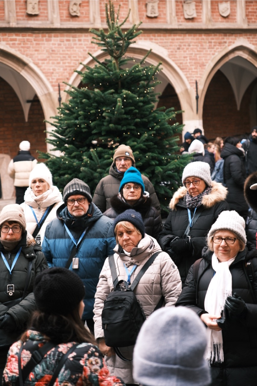 Zwiedziliśmy urokliwą Dzielnicę Żydowską (Kazimierz), gdzie spacer po brukowanych uliczkach z synagogą i cmentarzem Remuh przeniósł nas w świat dawnych tradycji – cisza, kamienne macewy i echo historii dodawały mistycznej głębi. Potem serce Krakowa: Brama Floriańska i Rynek Główny, największy średniowieczny plac Europy, udekorowany choinkami i straganami z rękodziełem! W Katedrze Mariackiej zachwycaliśmy się ołtarzem Wita Stwosza – arcydziełem gotyku! Byliśmy świadkami uroczystego otwarcia tryptyku. Z kolei o 12.00 z wieży Mariackiej wysłuchaliśmy hejnału, który rozbrzmiewa jak wołanie aniołów nad miastem. Odwiedziliśmy także Collegium Maius, najstarszy uniwersytet w Polsce, gdzie podziwialiśmy genialny, ruchomy zegar astronomiczny Jagielloński – tykający skarb średniowiecznej nauki.