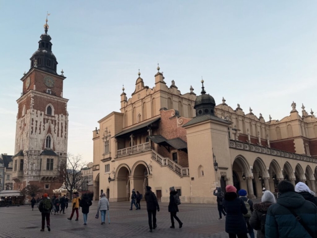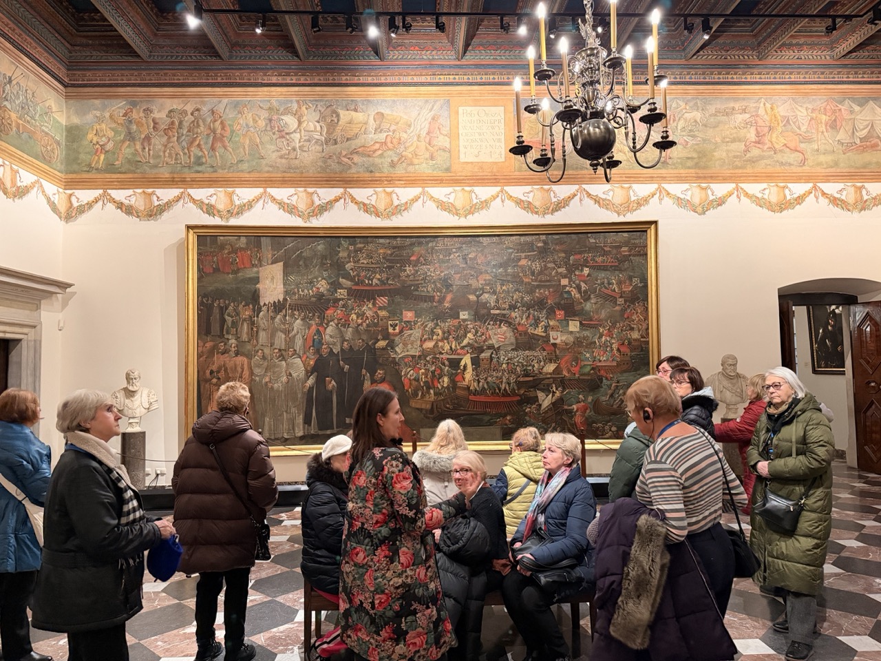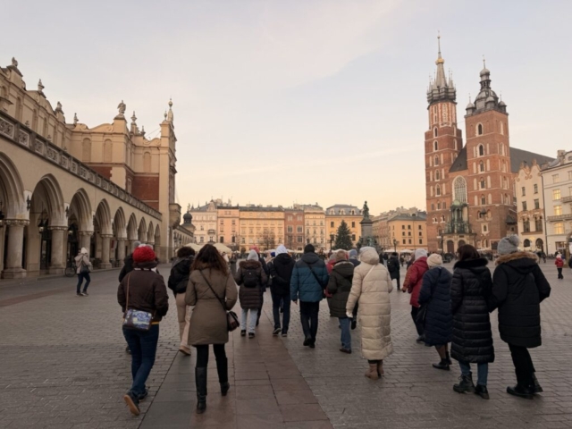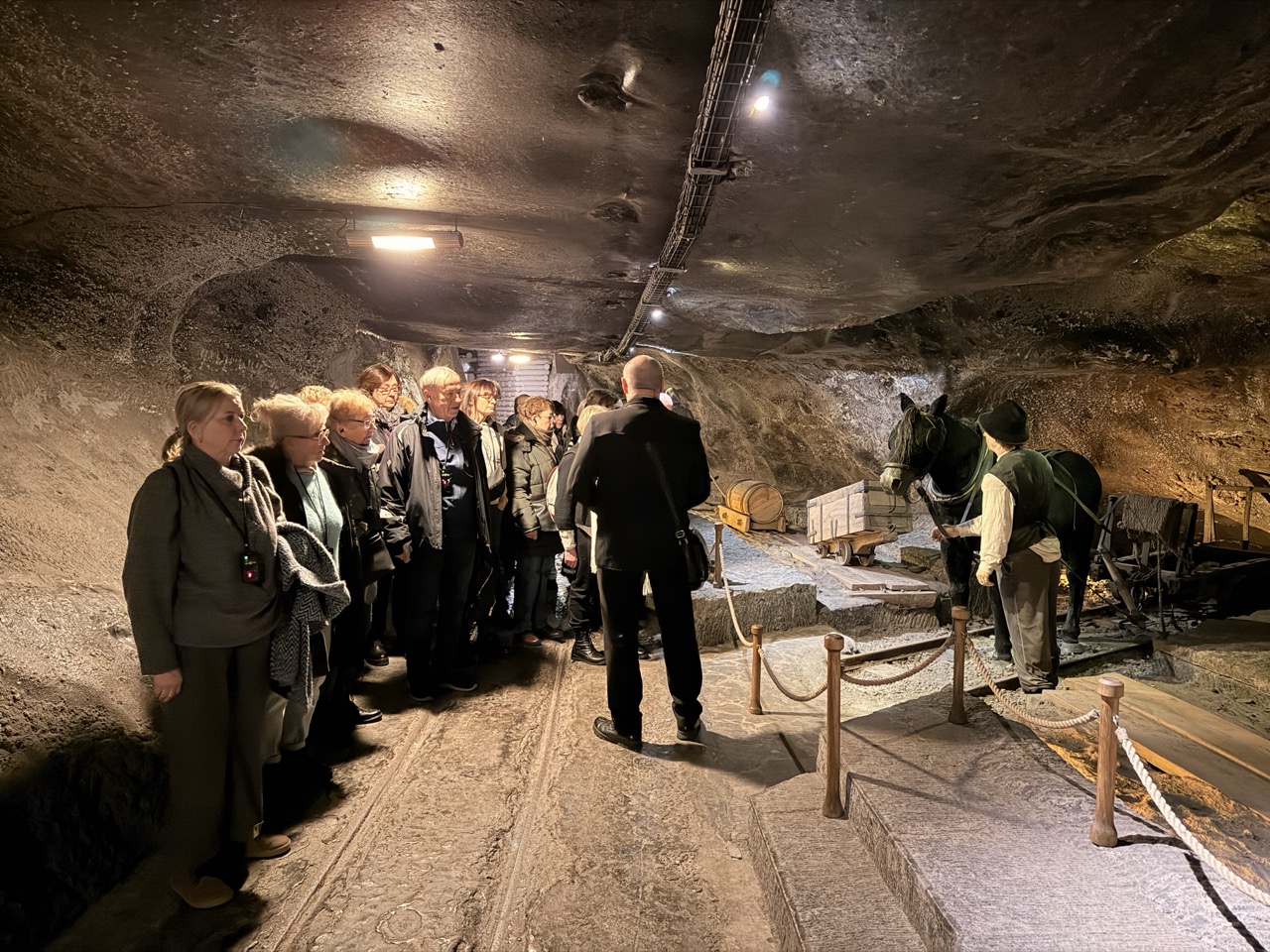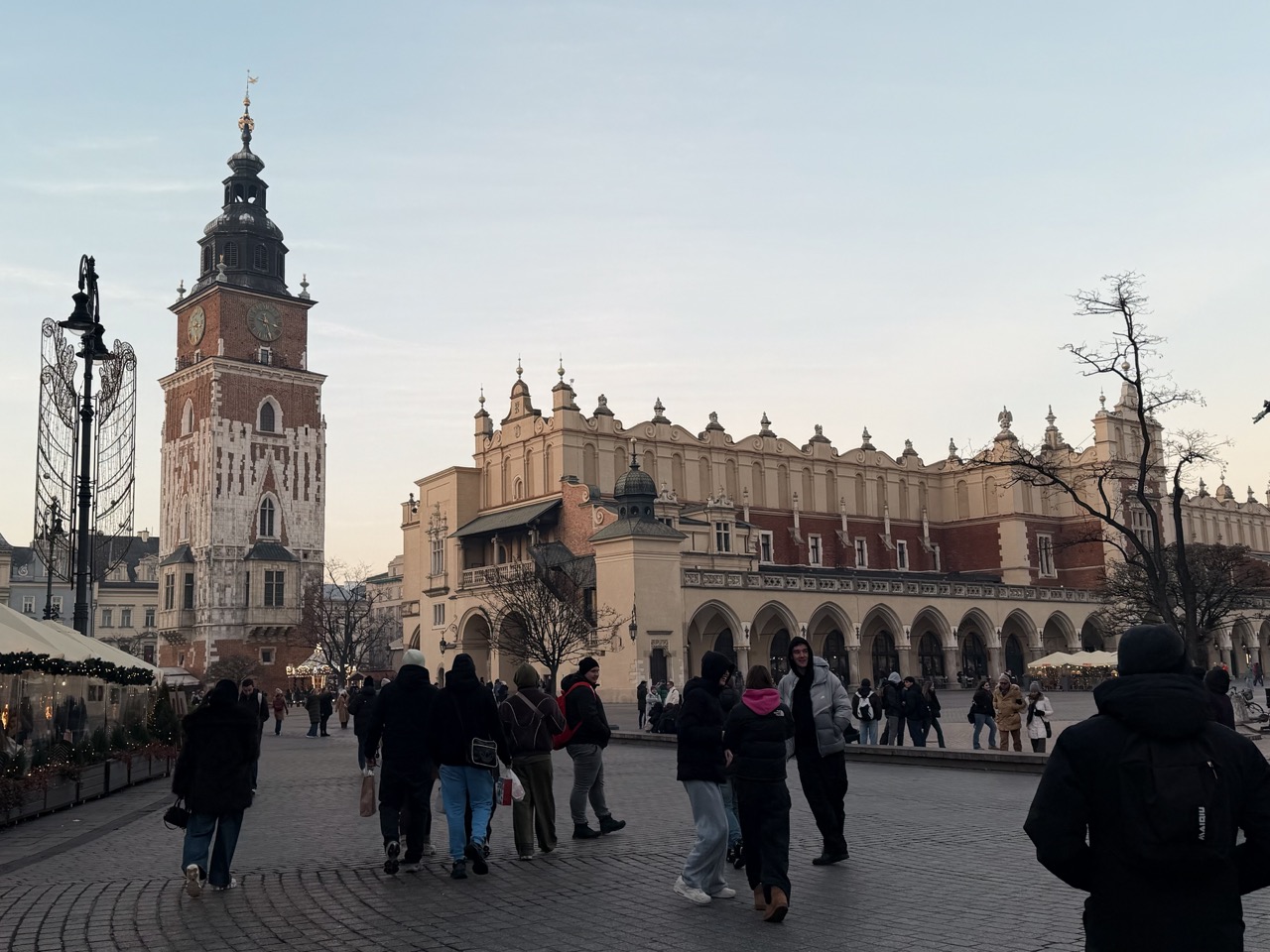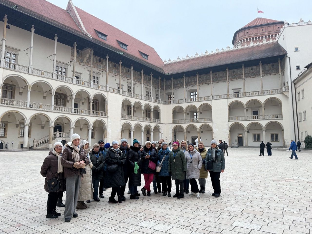 Zwiedziliśmy urokliwą Dzielnicę Żydowską (Kazimierz), gdzie spacer po brukowanych uliczkach z synagogą i cmentarzem Remuh przeniósł nas w świat dawnych tradycji – cisza, kamienne macewy i echo historii dodawały mistycznej głębi. Potem serce Krakowa: Brama Floriańska i Rynek Główny, największy średniowieczny plac Europy, udekorowany choinkami i straganami z rękodziełem! W Katedrze Mariackiej zachwycaliśmy się ołtarzem Wita Stwosza – arcydziełem gotyku! Byliśmy świadkami uroczystego otwarcia tryptyku. Z kolei o 12.00 z wieży Mariackiej wysłuchaliśmy hejnału, który rozbrzmiewa jak wołanie aniołów nad miastem. Odwiedziliśmy także Collegium Maius, najstarszy uniwersytet w Polsce, gdzie podziwialiśmy genialny, ruchomy zegar astronomiczny Jagielloński – tykający skarb średniowiecznej nauki.