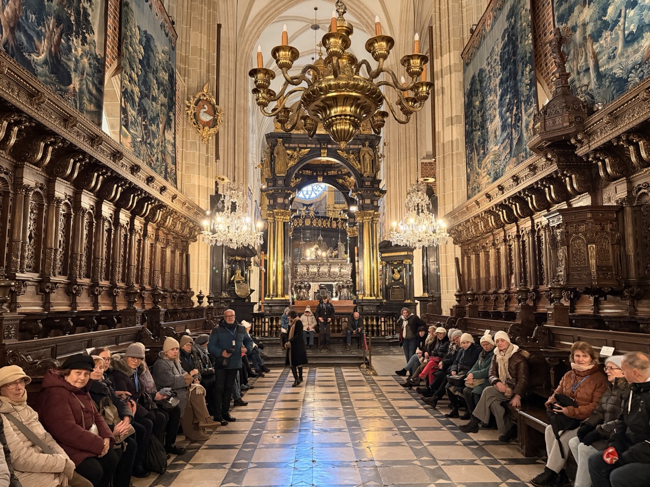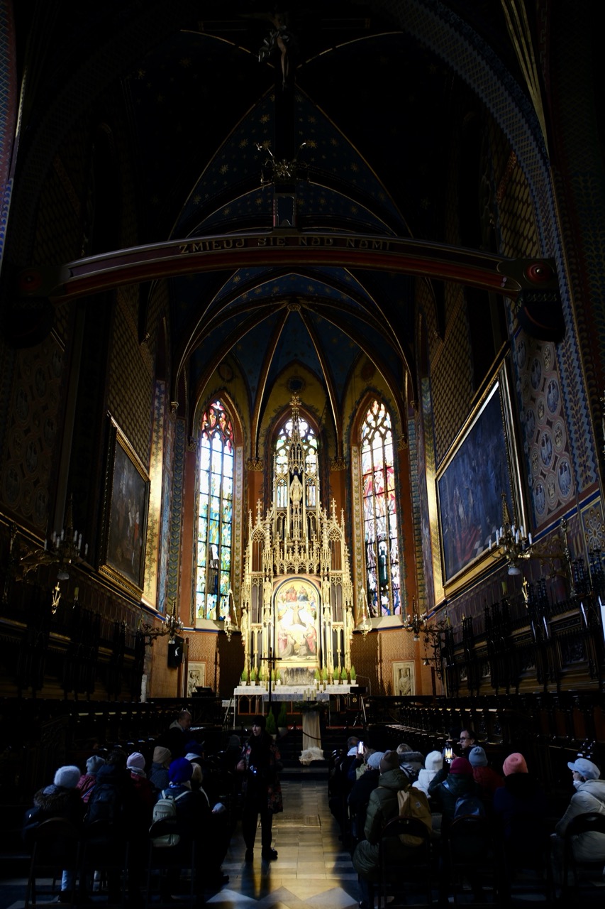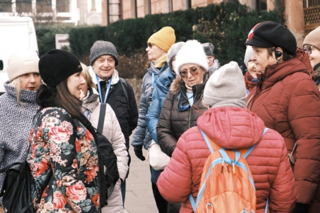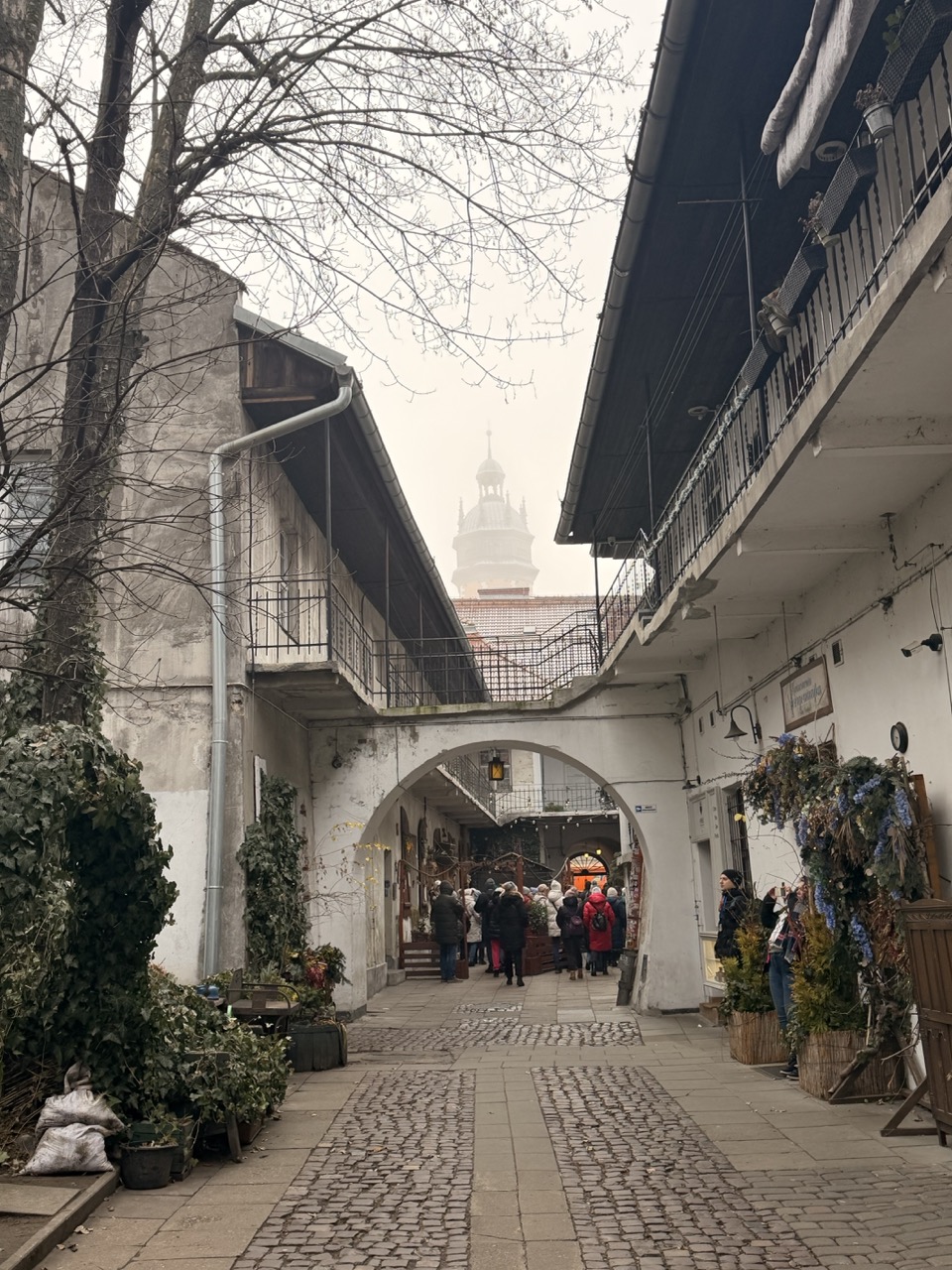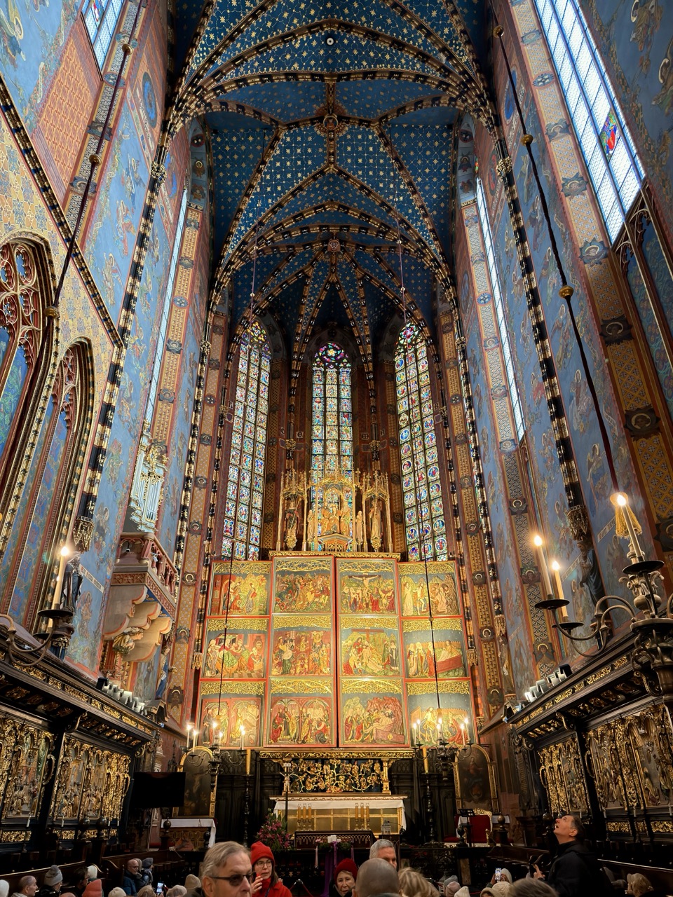 Zwiedziliśmy urokliwą Dzielnicę Żydowską (Kazimierz), gdzie spacer po brukowanych uliczkach z synagogą i cmentarzem Remuh przeniósł nas w świat dawnych tradycji – cisza, kamienne macewy i echo historii dodawały mistycznej głębi. Potem serce Krakowa: Brama Floriańska i Rynek Główny, największy średniowieczny plac Europy, udekorowany choinkami i straganami z rękodziełem! W Katedrze Mariackiej zachwycaliśmy się ołtarzem Wita Stwosza – arcydziełem gotyku! Byliśmy świadkami uroczystego otwarcia tryptyku. Z kolei o 12.00 z wieży Mariackiej wysłuchaliśmy hejnału, który rozbrzmiewa jak wołanie aniołów nad miastem. Odwiedziliśmy także Collegium Maius, najstarszy uniwersytet w Polsce, gdzie podziwialiśmy genialny, ruchomy zegar astronomiczny Jagielloński – tykający skarb średniowiecznej nauki.