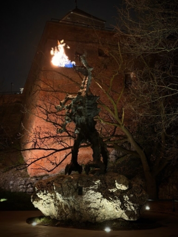 Przeszliśmy na Wawel – wzgórze królów, zwiedziliśmy majestatyczną Katedrę Wawelską z grobami monarchów i Zamek Królewski z bogatymi komnatami. Spotkaliśmy także legendarnego Smoka Wawelskiego, który zieje ogniem do dzisiaj!